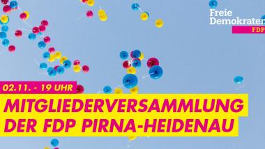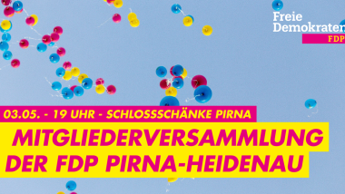 Die FDP Pirna-Heidenau läd zur offenen Mitgliederversammlung in den Biergarten der Schloßschänke Pirna ein. Dazu äußerte sich Marco Müller, Vorsitzender der FDP Pirna-Heidenau: "Wir freuen uns sehr, am 03.05.2022 ab 19 Uhr bei unserer Mitgliederversammlung viele...